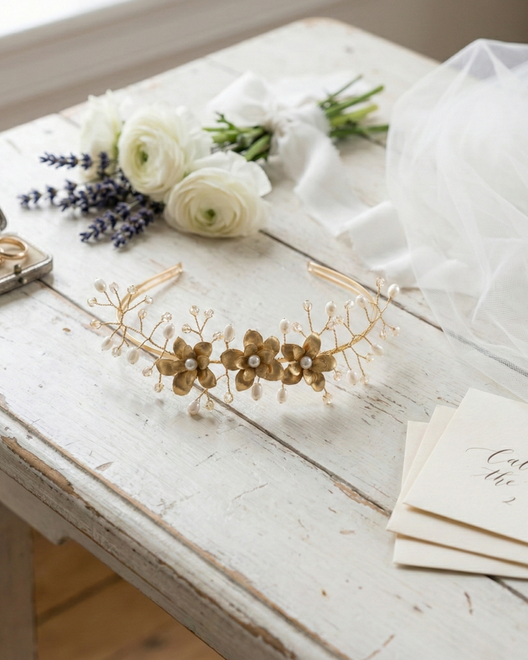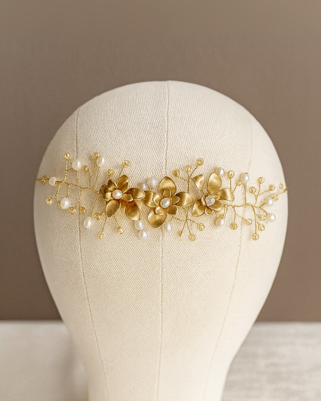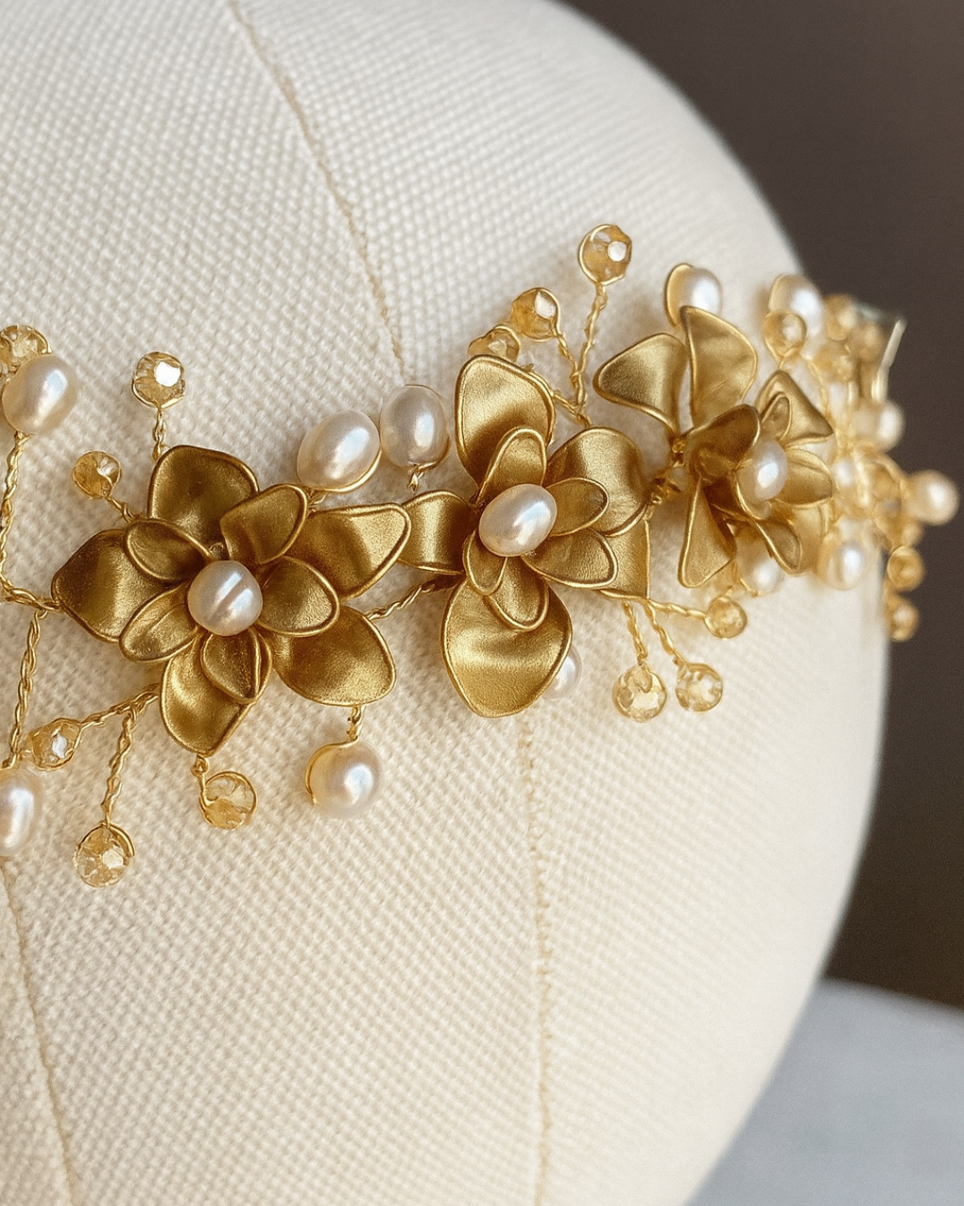 Un tocado dorado con flores artesanales y perlas que equilibra elegancia y romanticismo en un solo diseño.