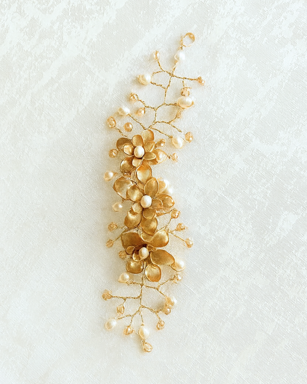 La tiara Amélie, es pura sofisticación francesa hecha joya para el cabello. Con delicadas flores doradas trabajadas a mano y detalles de perlas que parecen pequeñas luces suspendidas, este diseño captura la esencia de una novia elegante, romántica y luminosa.