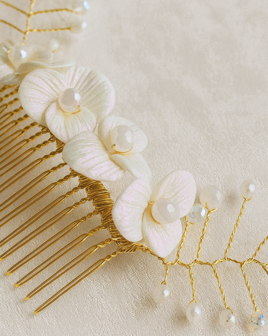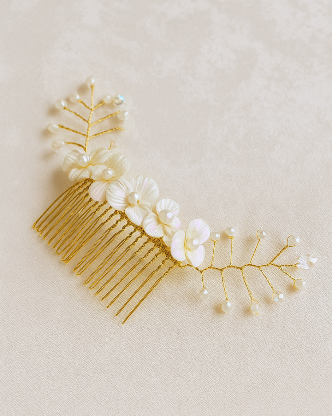 El diseño combina flores nacaradas hechas a mano con finos alambres dorados y cristales facetados que capturan la luz con cada movimiento. Su estructura ligera y flexible permite colocarla fácilmente en recogidos, moños bajos o semirrecogidos, aportando un toque romántico y sofisticado.