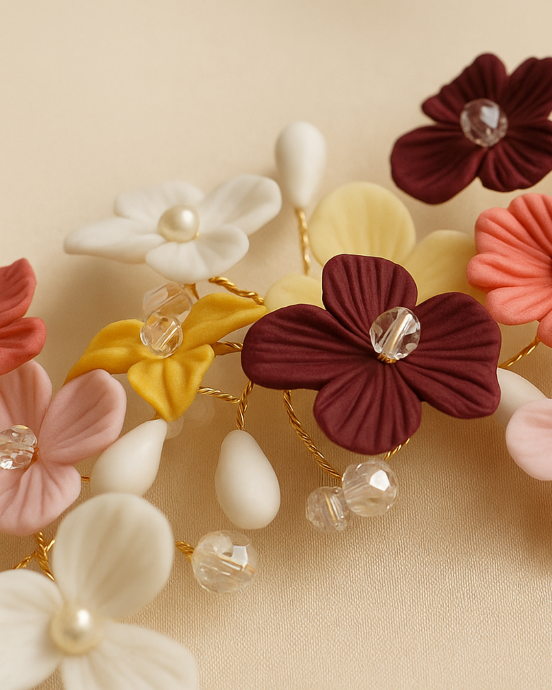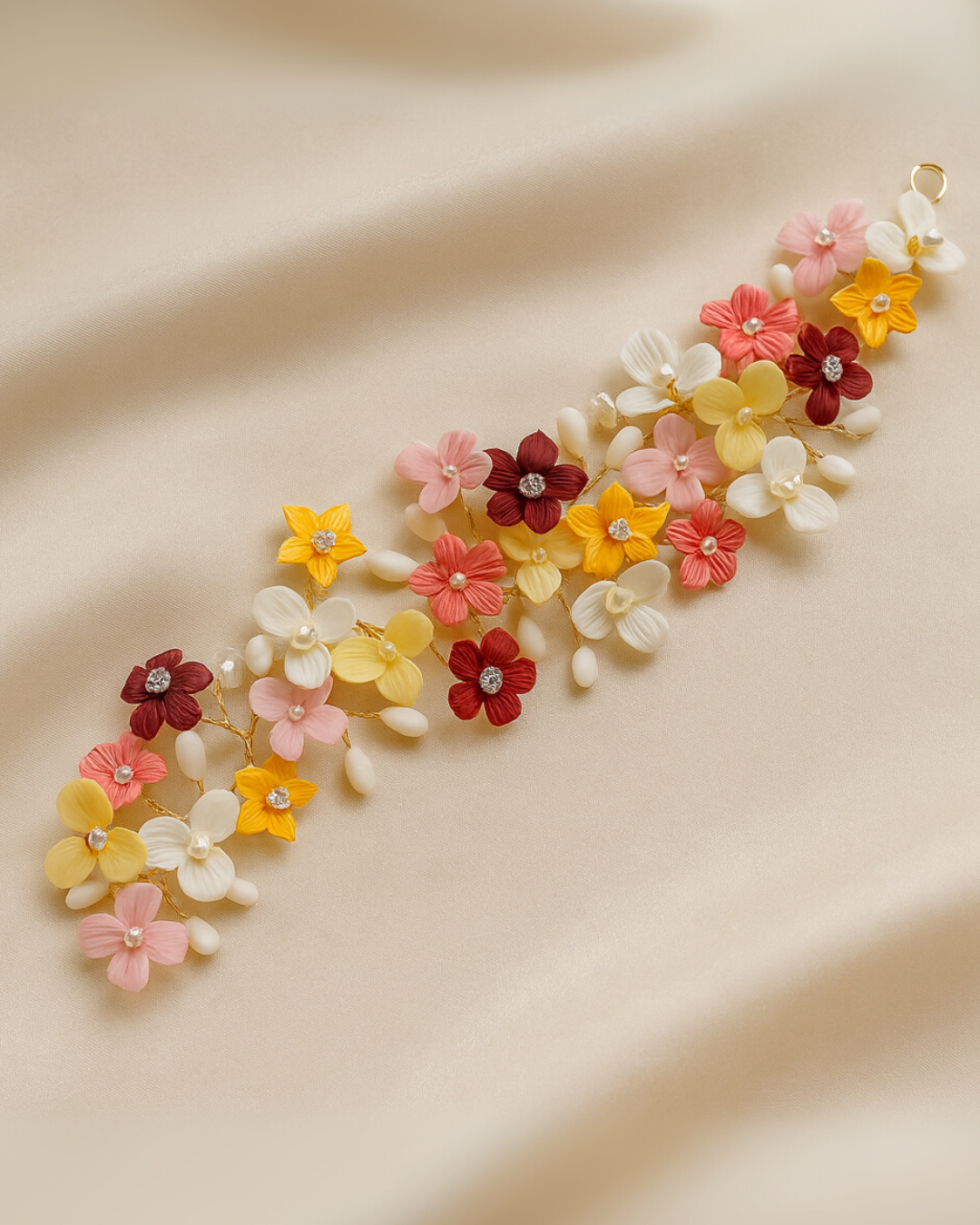 La tiara Carnaval es pura felicidad hecha accesorio. Inspirada en la magia de la primavera y la vibra festiva de un carnaval, está compuesta por delicadas flores en tonos rojo, rosa, amarillo y blanco, cada una modelada a mano y unida con alambre fino en un trabajo completamente artesanal.