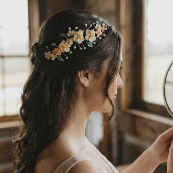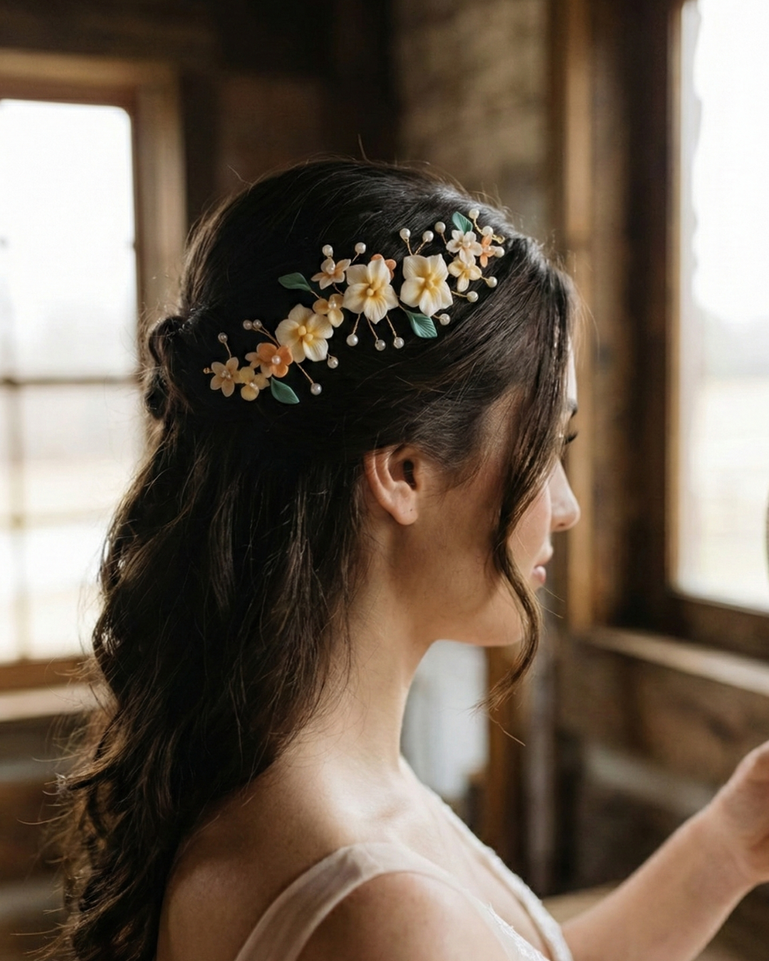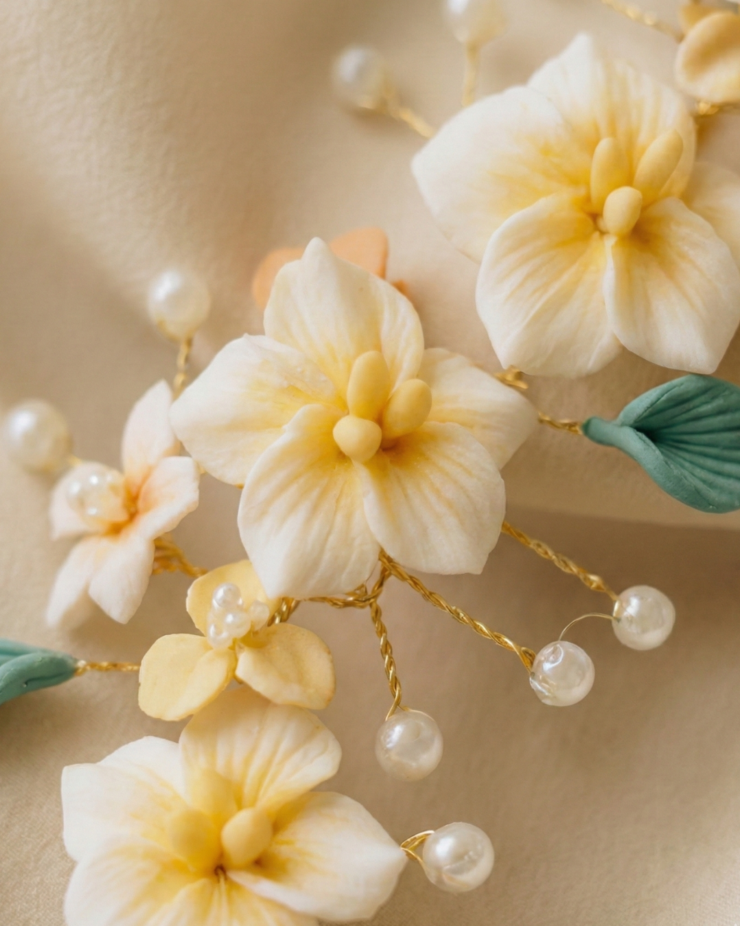 Cada flor ha sido modelada a mano en porcelana fría, con pétalos en tonos marfil, melocotón y toques de mostaza. Las hojas verde menta y las ramitas con perlas y cristales blancos le dan un acabado delicado y armonioso.