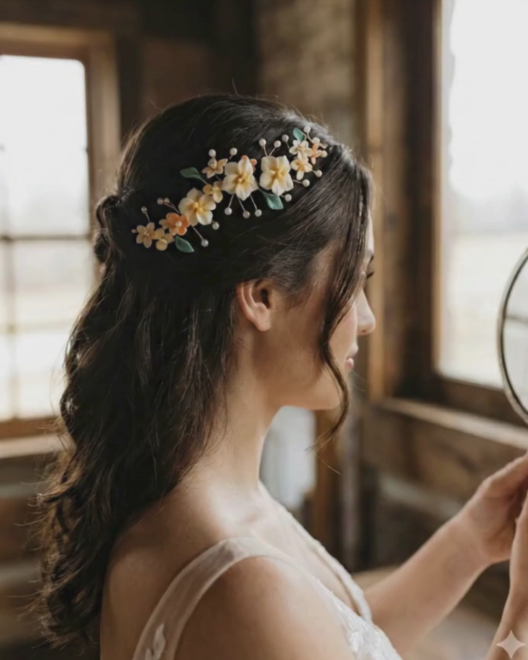 Un tocado romántico y lleno de color, perfecto para novias que buscan un look natural, artesanal y diferente. Hecho a mano con amor.