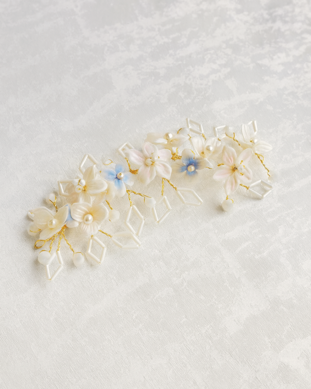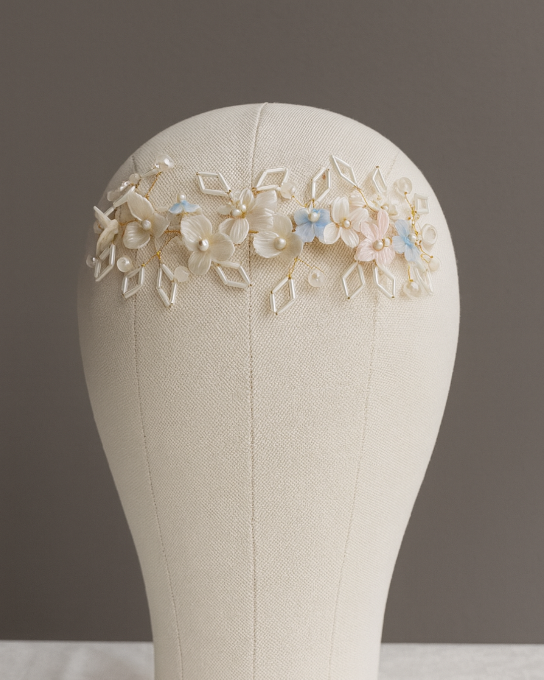 La tiara Jazmín es una pieza delicada y sofisticada diseñada para resaltar la belleza natural de la novia en su gran día. Inspirada en la pureza de las flores de jazmín, esta tiara combina flores nacaradas hechas a mano, detalles en perlas y cristales finos, junto con toques de color en tonos suaves que aportan frescura y romanticismo.