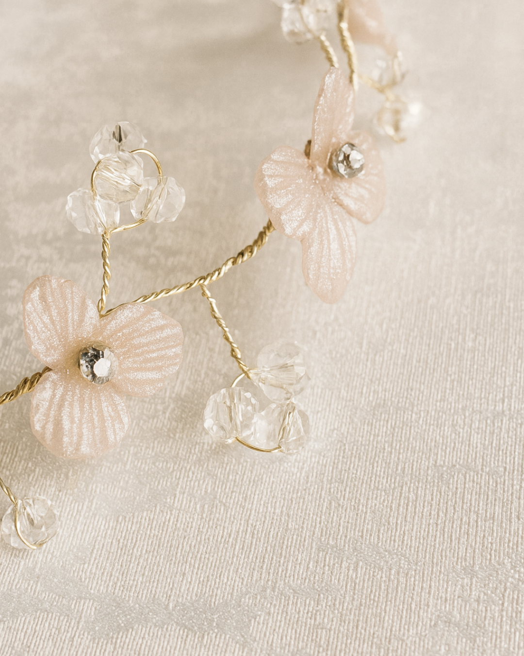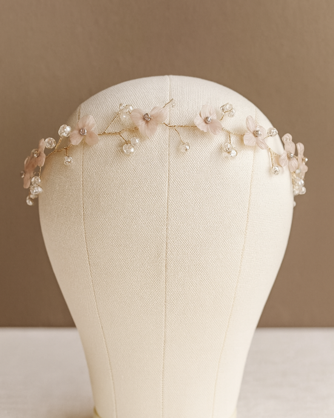 Tiara de novia con delicadas flores en tono rosa suave y cristales transparentes, diseñada para aportar brillo y elegancia a tu peinado en el día de tu boda.