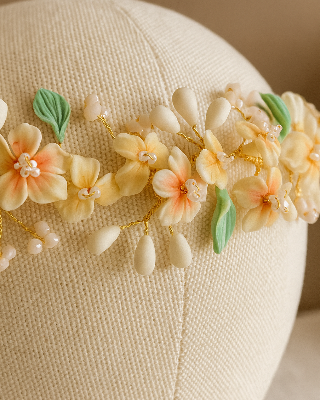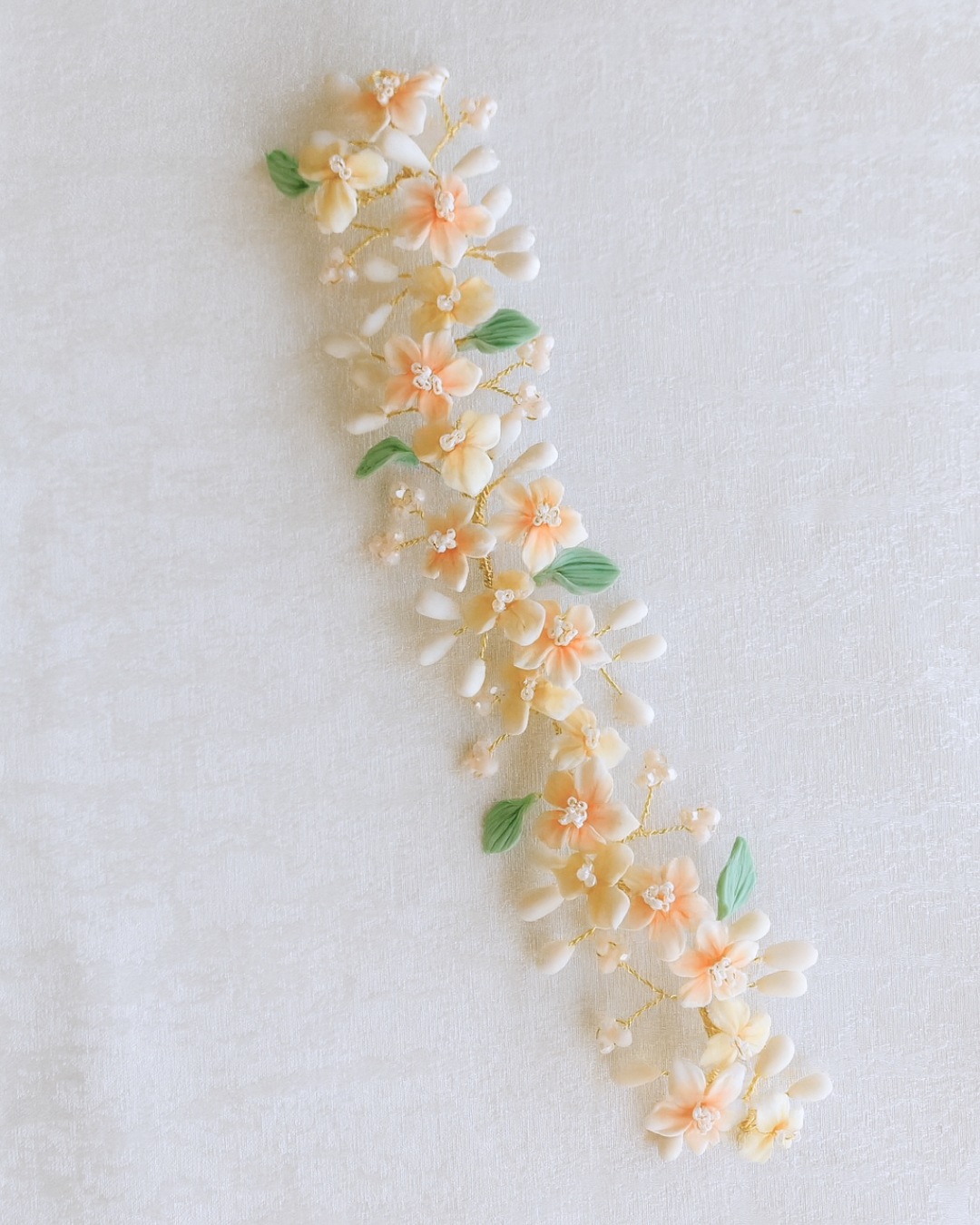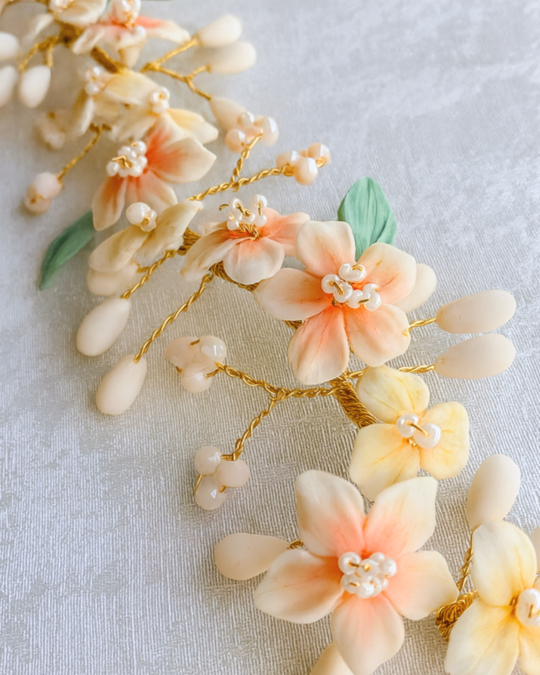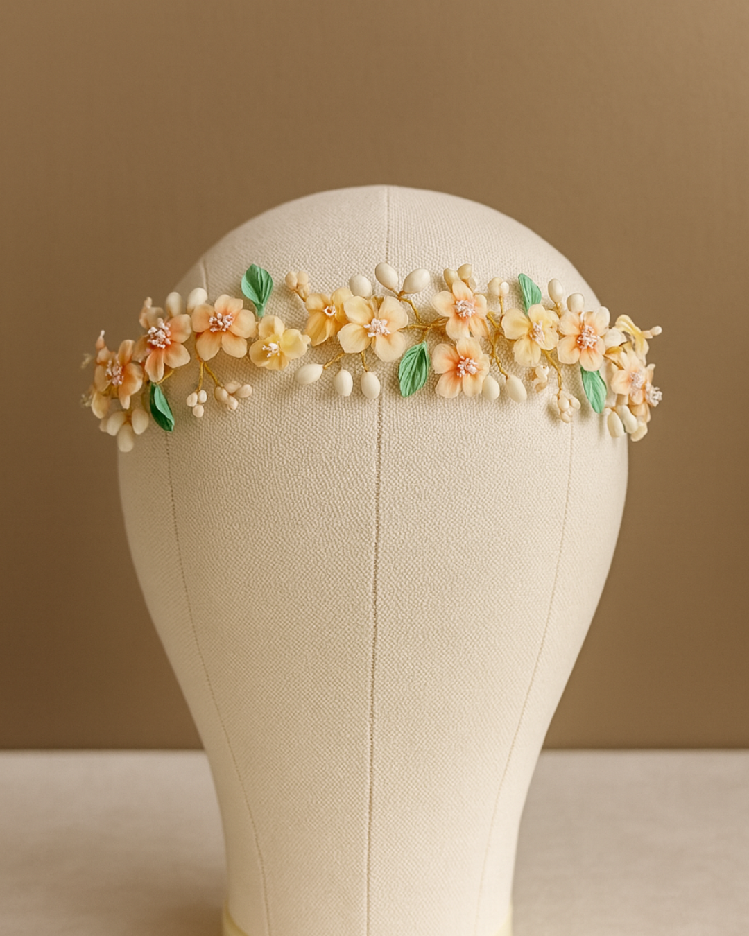 Cada flor está cuidadosamente modelada en tonos durazno, crema y marfil, complementada con delicadas hojas en verde suave y pequeños capullos perlados que aportan textura y movimiento. Su estructura flexible en alambre dorado permite adaptarla a diferentes peinados —ya sea un recogido, trenza o cabello suelto— ofreciendo comodidad y ligereza durante toda la celebración.