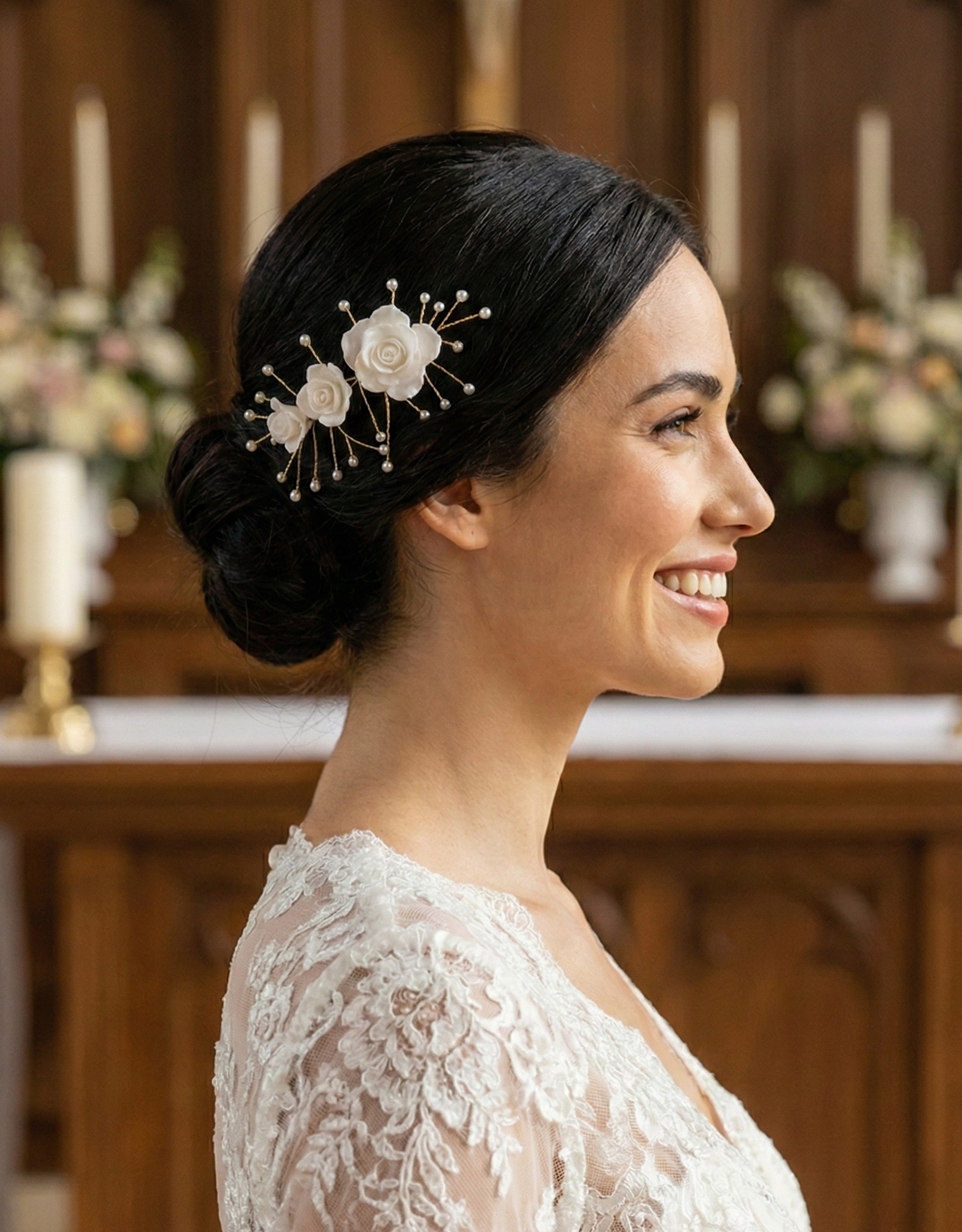 La tiara Magnolia puede adaptarse fácilmente a diferentes estilos de peinado —recogidos bajos, semirrecogidos o cabello suelto— gracias a su estructura flexible y ligera, garantizando comodidad durante toda la celebración.