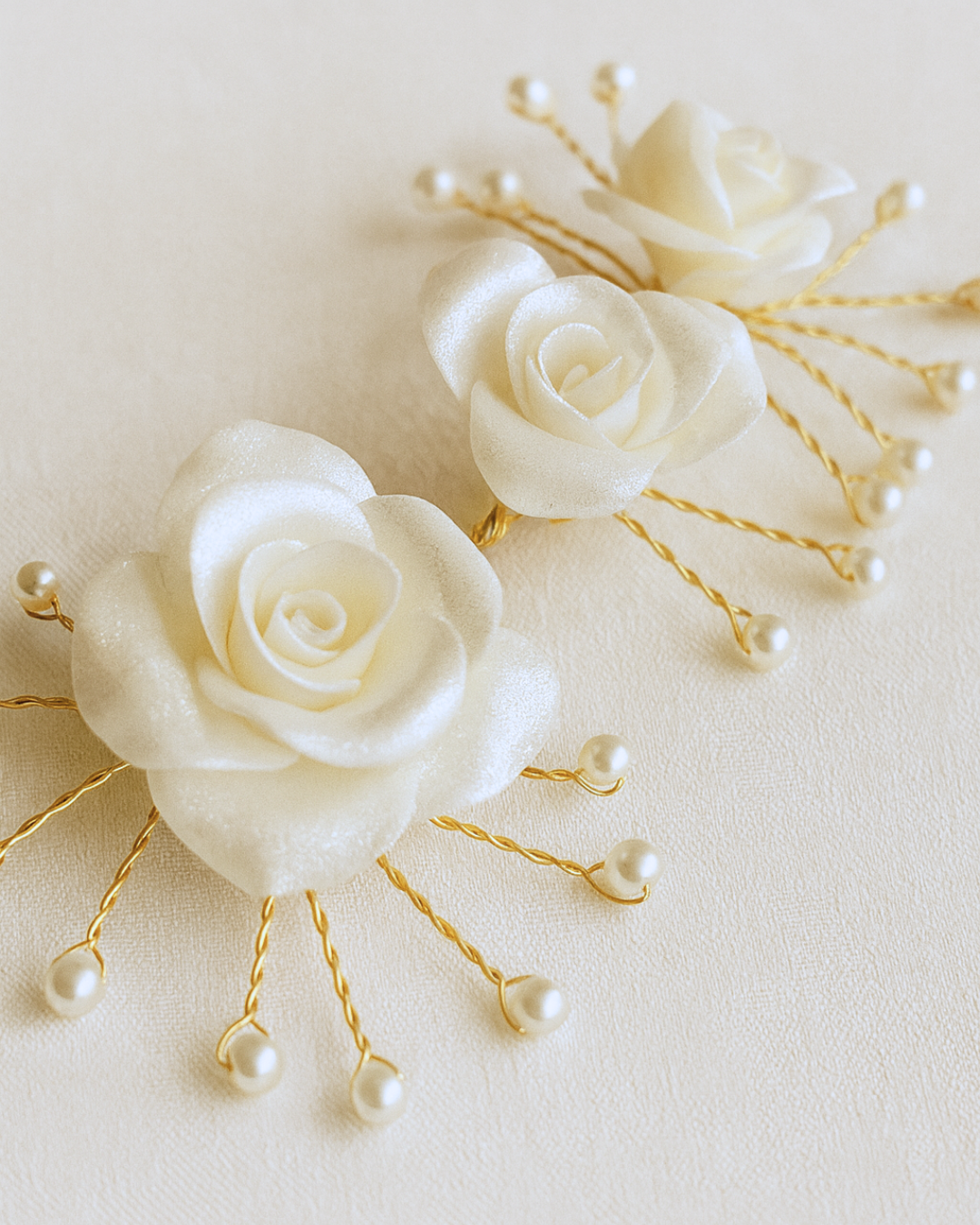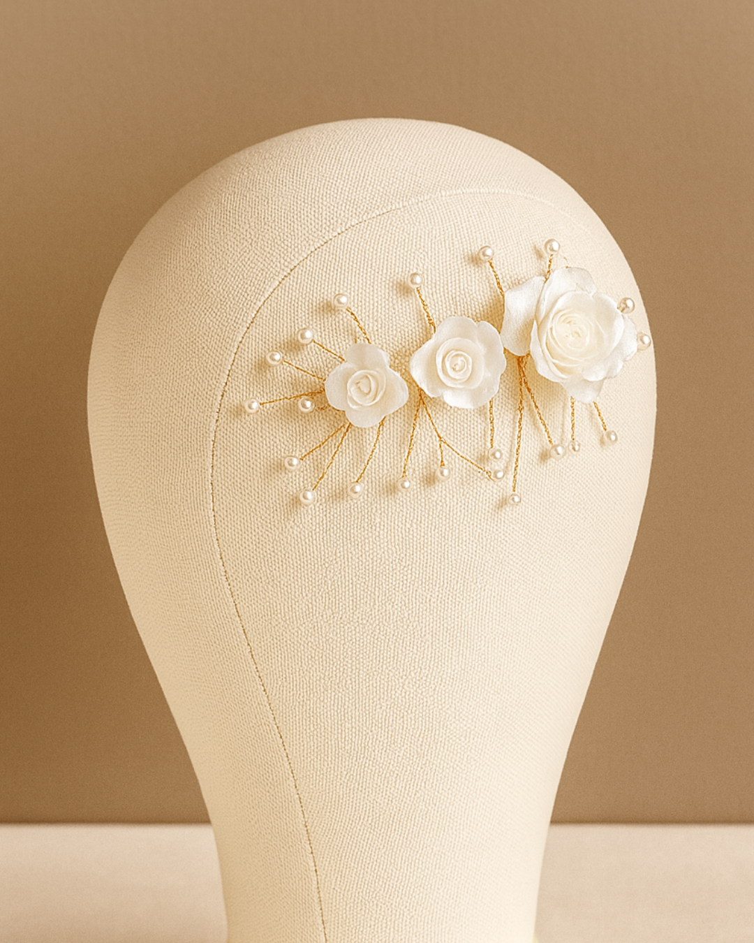 Cada flor está cuidadosamente modelada a mano en tonos marfil con un sutil brillo perlado, evocando la frescura de los pétalos naturales. Los detalles en alambre dorado trenzado y las pequeñas perlas de acabado nacarado añaden movimiento, textura y luz, creando una armonía visual que resalta la feminidad y la sofisticación.
