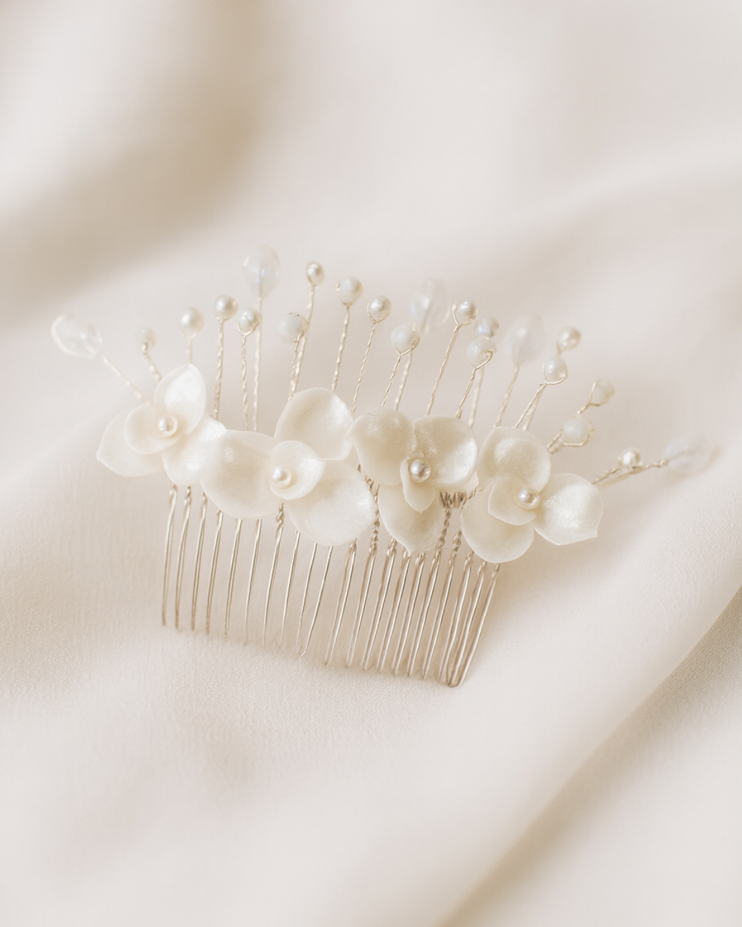 Sus ramas moldeables permiten adaptarla fácilmente a distintos peinados: recogidos bajos, semi recogidos o trenzas. Ideal para bodas civiles, ceremonias religiosas o sesiones de fotos de novia.