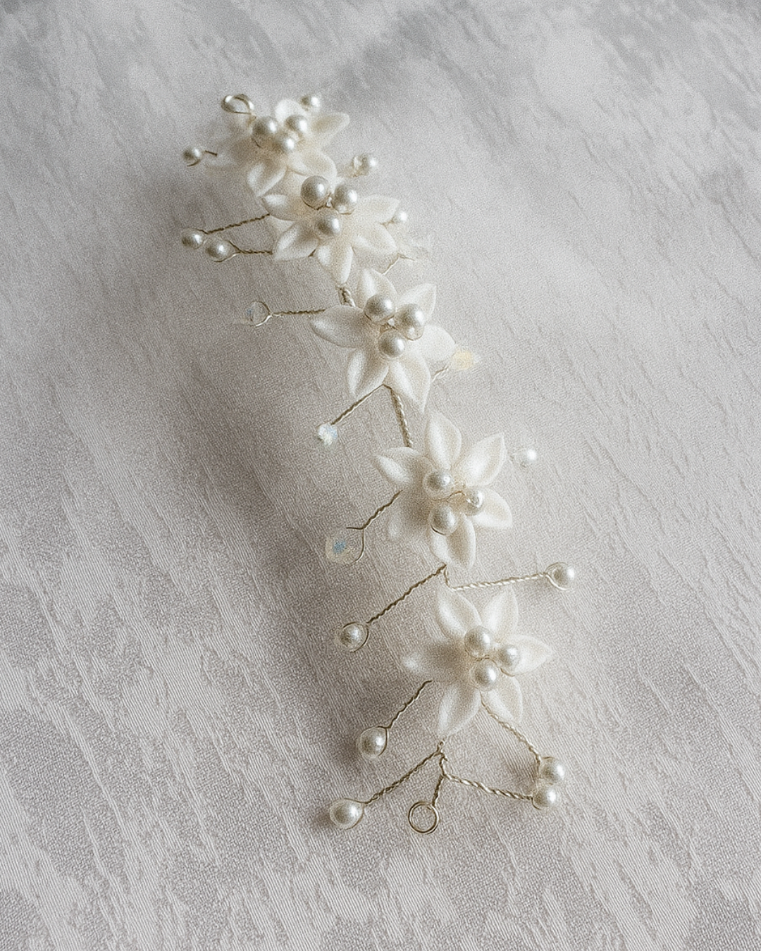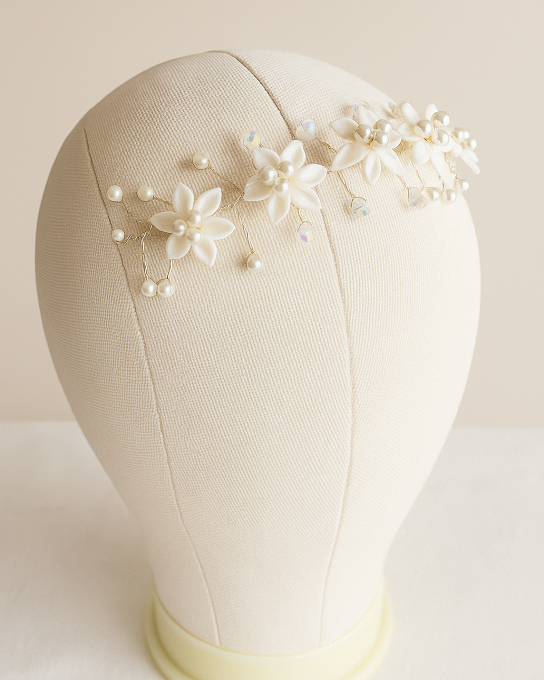 Eleva tu look nupcial con esta exquisita tiara floral hecha a mano, diseñada para novias que sueñan con un estilo romántico, delicado y sofisticado. Con flores en forma de estrella elaboradas con pétalos satinados, perlas de acabado nacarado y cristales tornasol, esta pieza captura la luz con sutileza y aporta un brillo etéreo al peinado.