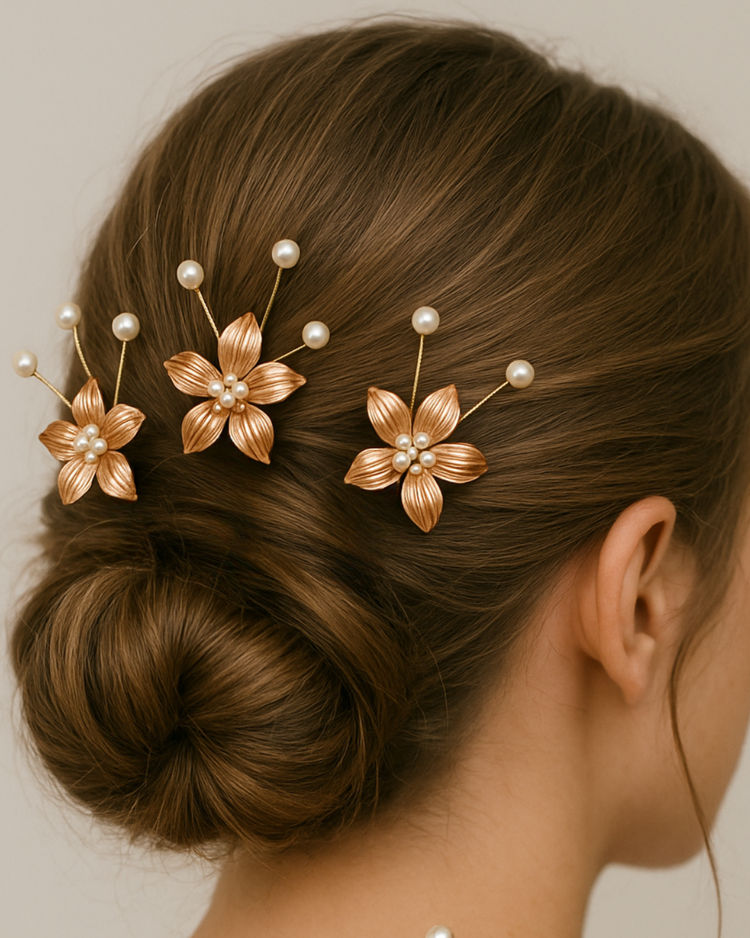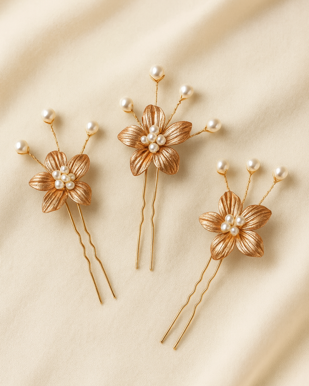 Hechos a mano con pétalos texturizados y perlas luminosas, estos tres pasadores se distribuyen juntos o separados para un look romántico y equilibrado. Ideales para todo tipo de peinados, no pesan y sujetan firme durante todo el día.