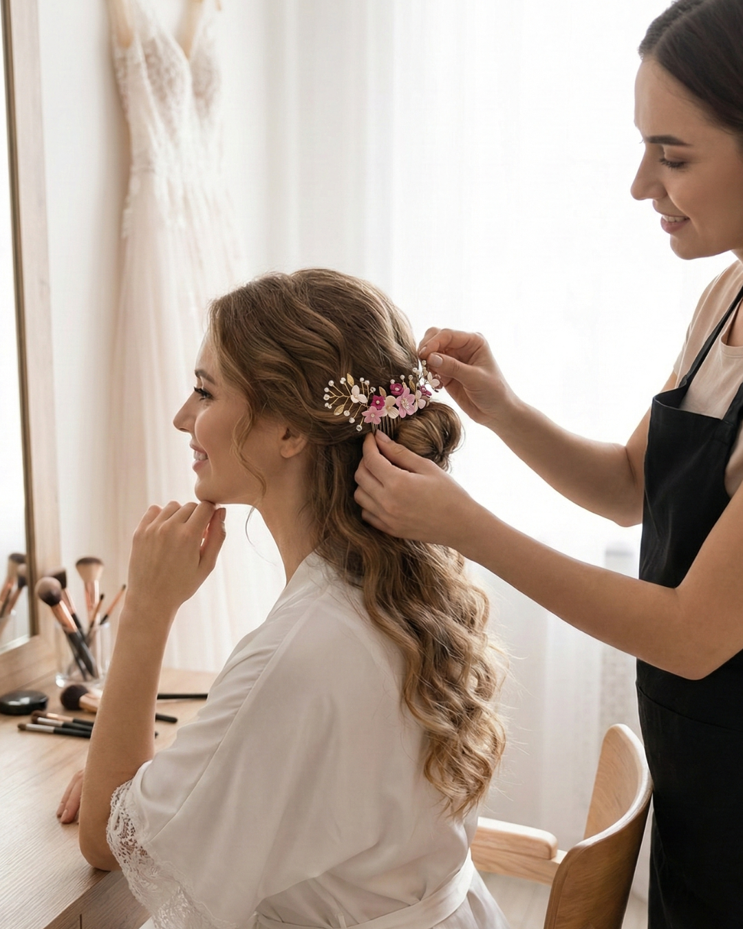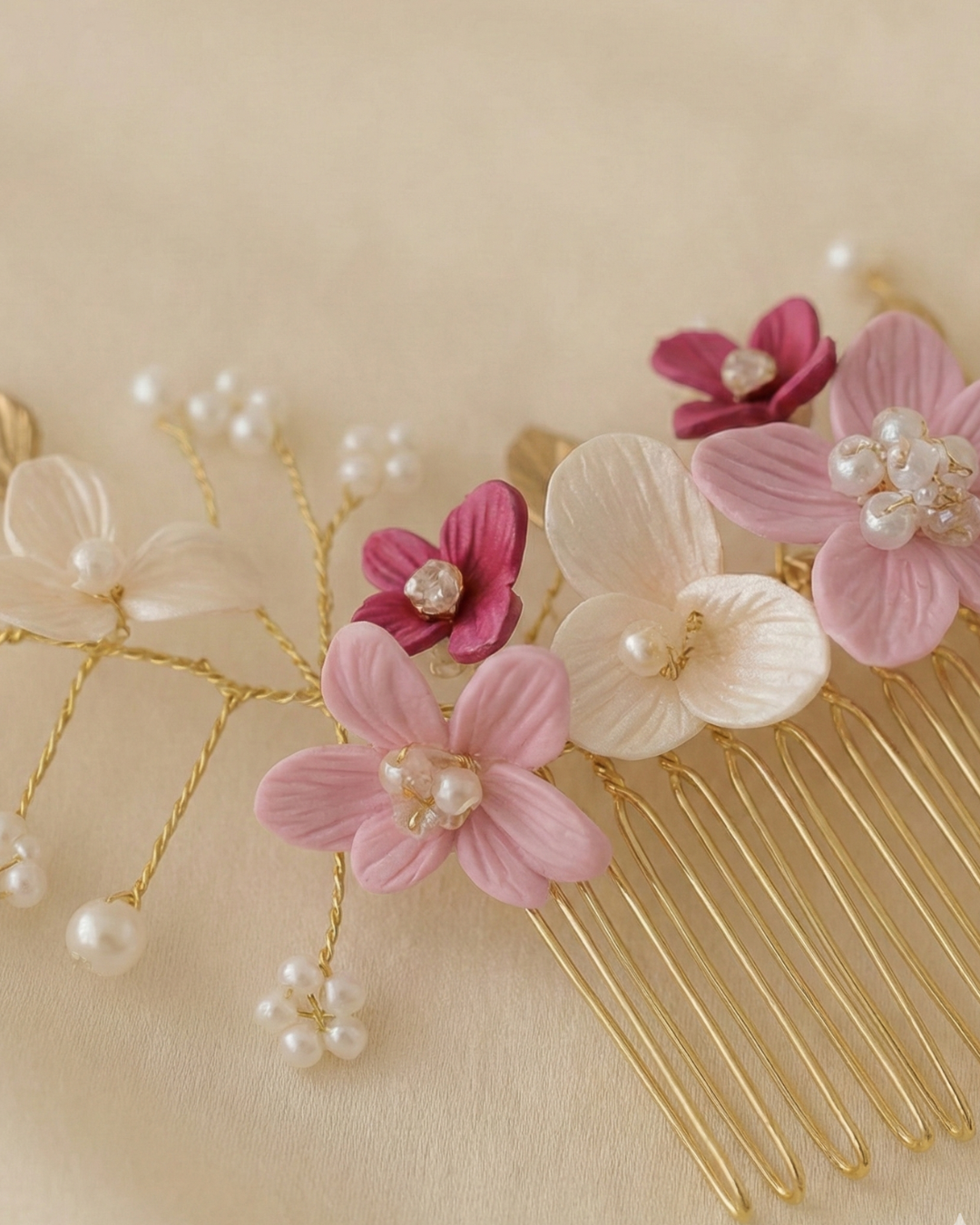 Cada pieza está cuidadosamente hecha a mano con alambre fino y flores modeladas pétalo por pétalo. Su carácter artesanal significa que cada peineta es única, con sutiles variaciones que la convierten en un accesorio tan especial como tu historia de amor.